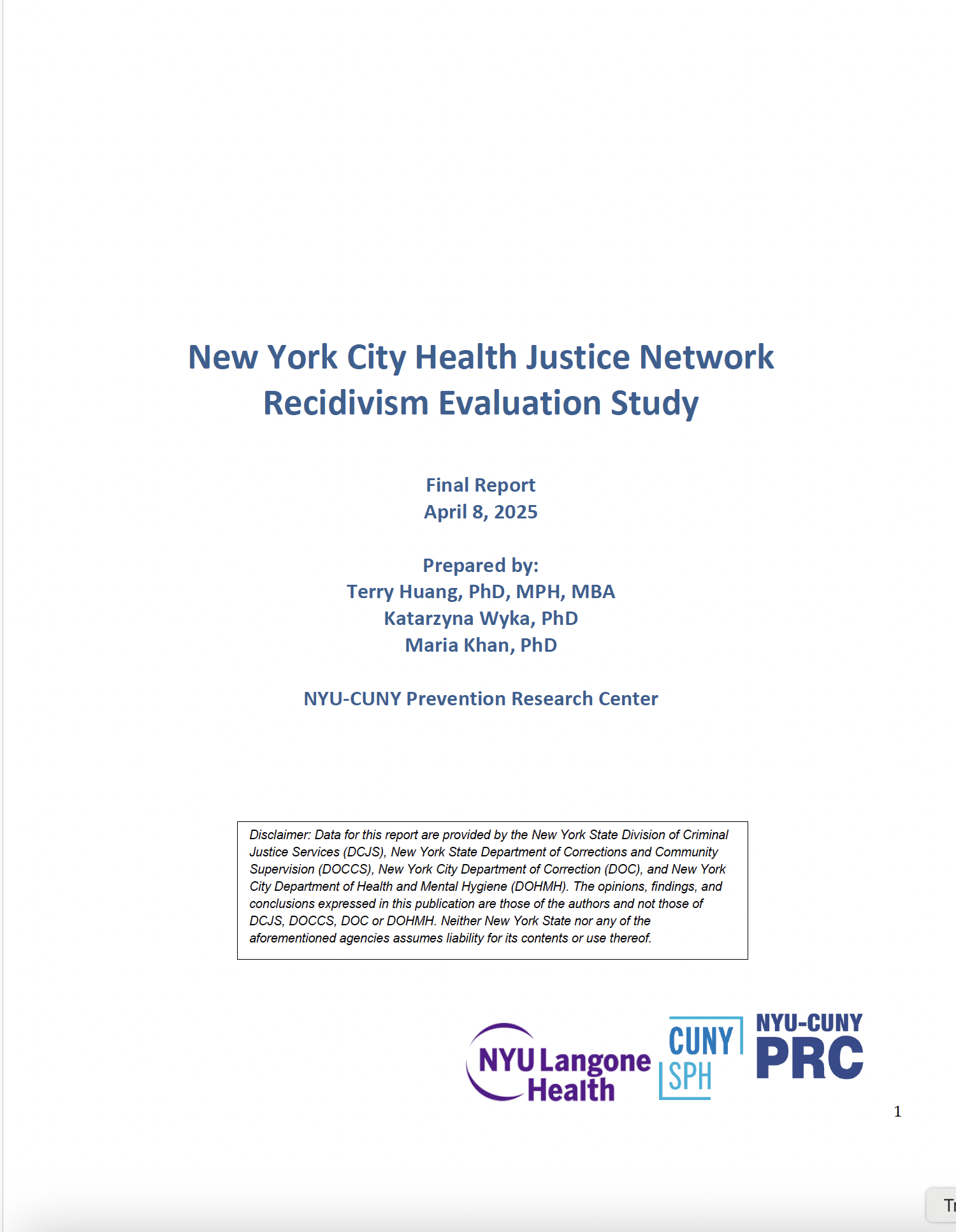 [From Our Partners] New York City Health Justice Network Recidivism Evaluation Study